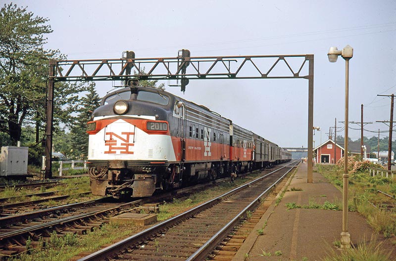 ABOVE: It was still “pure” New Haven Railroad in August 1968 when FL9 2010 led a train west into Old Saybrook. Head-end traffic was still robust, with three baggage cars leading four coaches. – T.J. Donahue