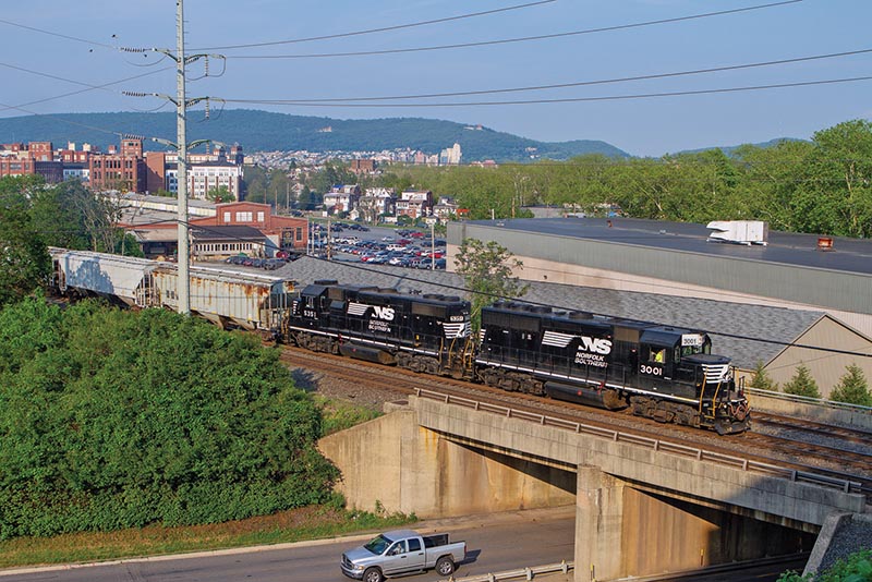 ABOVE: A late afternoon view from the parking lot at the Granite Point Medical Center shows former Reading GP40-2 3674, now NS 3001, leading a local west crossing over State Hill Road in Wyomissing, June 16, 2014. The 3001 was the last survivor of the three former Reading GP40-2s on the NS diesel roster.
