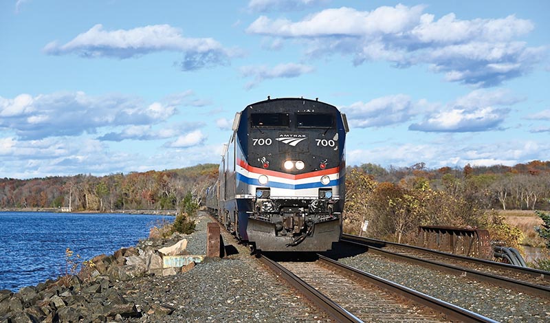 ABOVE: Ethan Allen Express Train 290 heads over the short girder bridge that spans the inlet that feeds North Bay from the Hudson River, November 4, 2025. P32AC-DMs 700 and 707 lead five Amfleet and P42C 9700.