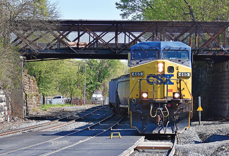 ABOVE: CSX L022, the Monday through Friday freight from Selkirk Yard to Hudson, New York, has arrived in Hudson to switch the ADM Mill in nearby Greenport. CSX AC4400CW 465 with 34 grain hoppers is stopped to allow the conductor to open the switch to the yard lead on May 9, 2022.