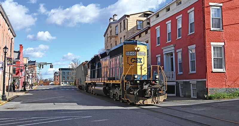 ABOVE: CSX SD40-2 8846 is viewed pulling 15 empty grain hoppers back to Hudson Yard running down South 7th Street from Warren Street to Union Street in Hudson, November 4, 2025.
